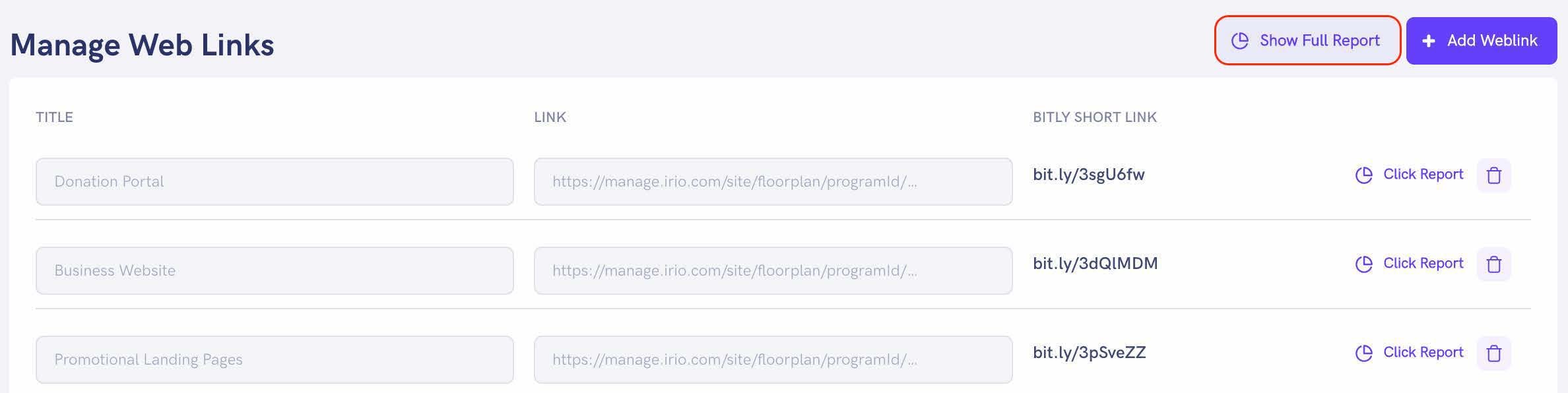 You can view overall performance for all links by clicking the Show Full Report button on the top-right of the Manage Web Links page.